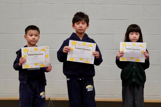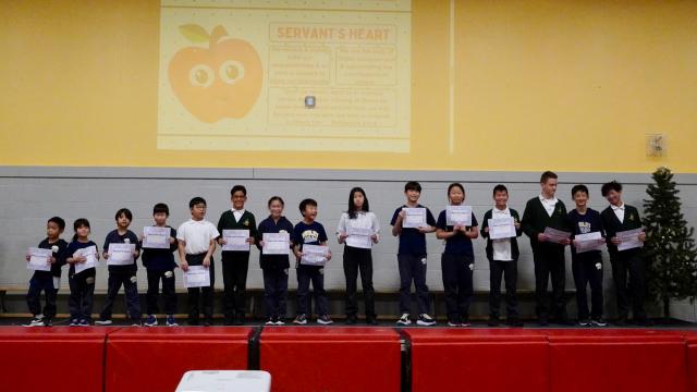 On Thursday afternoon, Mrs. V led the celebration. She started by encouraging the students to read the description, actions, and key Bible verses associated with each CRISP trait before she announced the winners. The winners were nominated by teachers. Mrs. V read short descriptions about why each student was given the award. There are no fixed number of awards by grade or class so sometimes, there are many winners for a CRISP characteristic while other times, there may only be few winners for a specific category. As you can see from the photos, there were quite a few who were given the “Servant’s Heart” award this term.