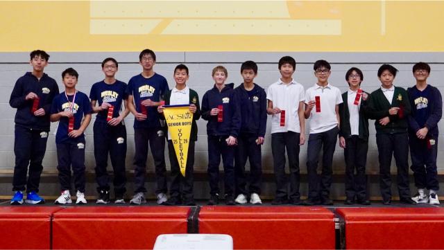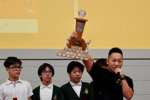 Next, Mr. Au brought a trophy to the forefront. It was a trophy for the Senior Boys Volleyball Tournament. This trophy had not been handed out in recent years. In fact, the last name plate on the trophy was from 2018 and it was awarded to Wesley! Mr. Au shared that there does not seem to be trophies for the Senior Girls or Junior Co-Ed Volleyball Teams so the trophy would represent the prize for all three teams!