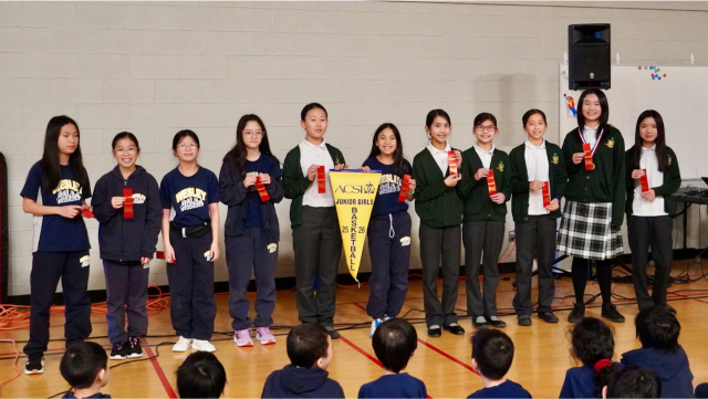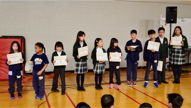On Tuesday afternoon, Mrs. V led the celebration. She started by encouraging the students to read the description, actions, and key Bible verses associated with each CRISP trait before she announced the winners. The winners were nominated by teachers. Mrs. V read short descriptions about why each student was given the award. There are no fixed number of awards by grade or class so sometimes, there are many winners for a CRISP characteristic while other times, there may only be few winners for a specific category. As you can see from the photos, there were quite a few who were given the “Perseverance” award this term.