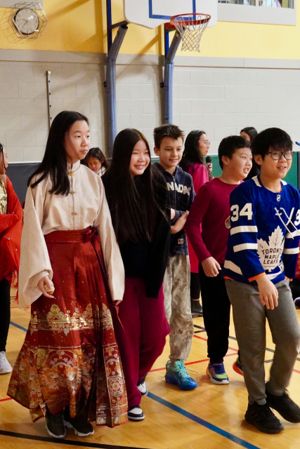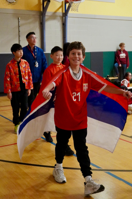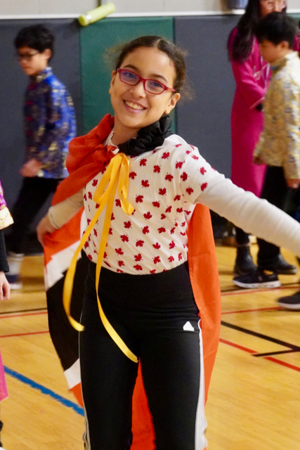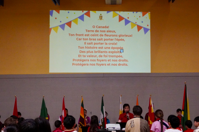 The day started with a special assembly for the elementary students. There was a sea of colours in the gymnasium when everyone arrived – not only from the clothing and accessories but from the large flags that the Grade 4 students were carrying at the front. To begin the assembly, Grade 1 students shared special greetings in various languages. Next, everyone sang the national anthem in French. This was followed by the Grade 4 classes reciting the Lord’s Prayer in French. It was said a second time by all students in Grades 4-8.