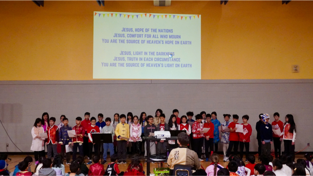 To give thanks for the hope that God has give our world through Jesus, the Grade 5 classes shared some thoughts about that before reciting John 3:16. Then, they sang “Jesus, Hope of the Nations”.