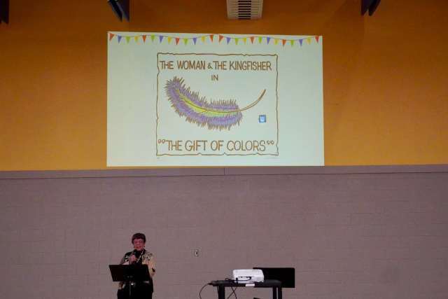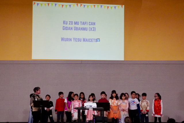 Next, Miss Phillips, who grew up in Nigeria, shared an African fable called “The Gift of Colours”. This tale was about a kingfisher bird who helped an injured woman, after two other birds refused to come to her aid. To reward the kingfisher, the woman painted this plain brown bird with beautiful colours. It was a story of kindness and letting our inner beautiful come forward. Miss Phillips shared that just like when we accept Jesus into our hearts, we become a new creation. We are not only given the gift of salvation but other fruit begin to be displayed such as a caring heart and kindness. She also reminded everyone that we are not too small or insignificant to make a difference. To make her point, she shared the African proverb “If you think you are too small to make a difference, you haven’t spent the night with a mosquito”. The Grade 3B class then sang a song called COME AND GO WITH ME – “KUZO MU TAFI CAN” in both English and Hausa, a major indigenous language mainly spoken in the northern part of Nigeria.