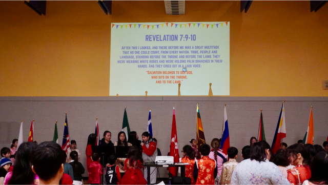 Grade 8 members of the various Chapel Teams and/or Worship Team then came forward to read several passages from Revelation 5 and 7 which recount the vast multitudes of angels and people from all nations who will one day worship God the Father and Jesus – the Lamb of God – in heaven. Everyone then sang “The Revelation Song” , and members of the Prayer & Care Team closed in prayer. They gave thanks for the gift of all the different nations and asked God to help us show Jesus’s love to all created.
