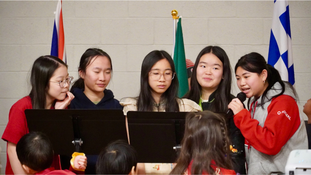 Our Grade 3 and 4 emcees then introduced activities that some of our classes have been doing to celebrate or learn more about different parts of the world. For example, the Grade 2 classes shared some photos of celebrations that they have had with their families (such as birthdays, Christmas, Lunar New Year, etc.) The Grade 6 classes have been researching and learning about immigration stories their own families have made to Canada or elsewhere. The Grade 7 class has been learning about and praying for persecuted Christians in various parts of the world. Lastly, the Grade 8 students have been looking at Francophone attractions in the world and creating travel brochures in French for these amazing destinations.