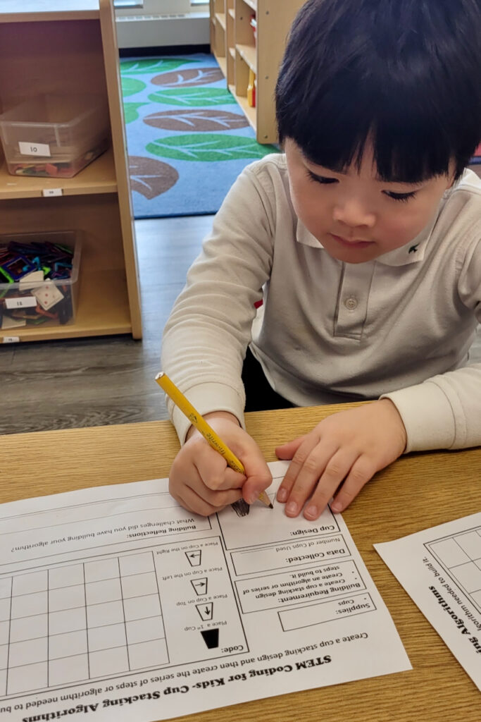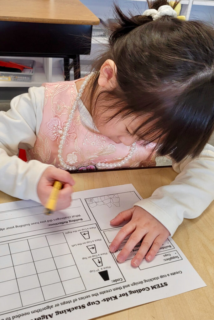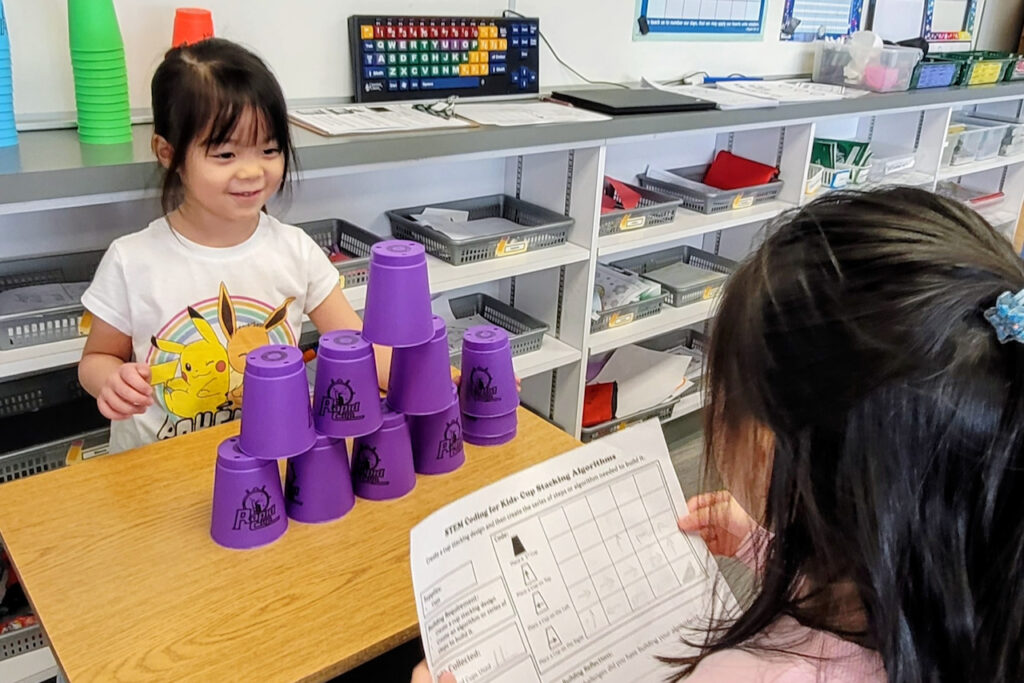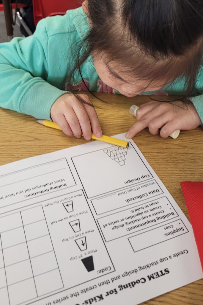 For our next activity, students individually created their own cup stacking design and then selected a “robot” teammate to follow their exact instructions to build it. The catch? The robot could only do what was written — nothing more, nothing less!
