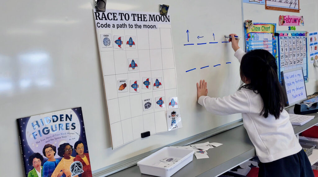 To extend our learning, students worked collaboratively using pre-designed coding boards to safely guide astronauts to the moon. While the boards were provided, students actively moved starting points, obstacles, and end points to create new challenges.