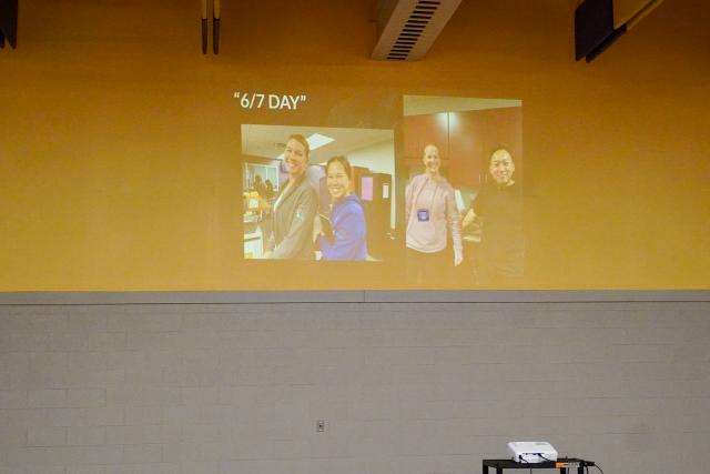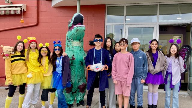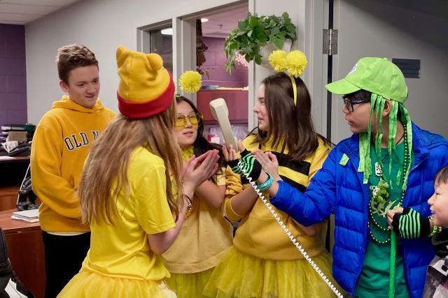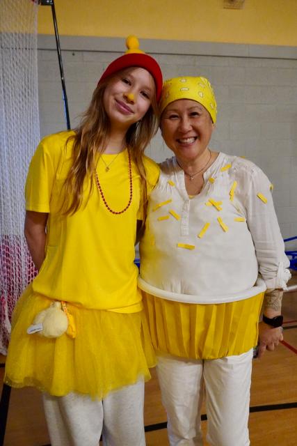 After lunch, there was a special assembly in the gym. Students sat with their teams and everyone admired each other’s outfits. Aside from wearing their team colours, many had accessories such as wigs, necklaces, hats, tutus, and sunglasses. Some even went “above and beyond” and created their own costumes!