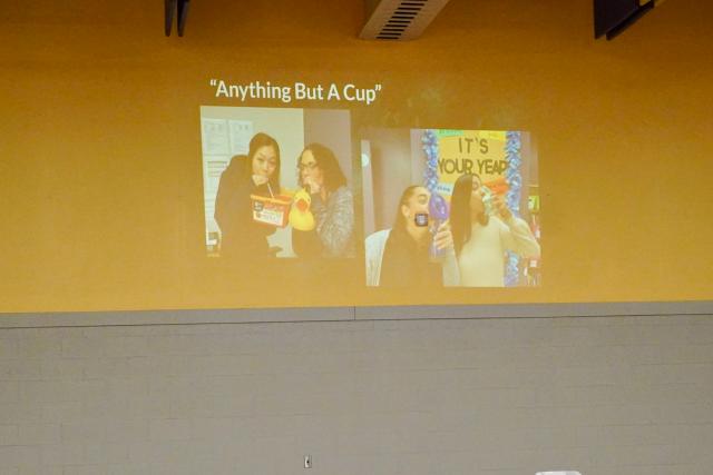 Next, each house team had a “cheer off” before settling down to watch a special slide show. It featured teachers and staff who had been secretly participating in “Undercover Spirit Days”. At various points in the past two months, teachers have been doing some unusual things. If students noticed and mentioned the theme, they received 5 house team points. Teachers were seen drinking out of “anything but a cup”, wearing “6’s and 7’s” and “Secret Agent Day”.