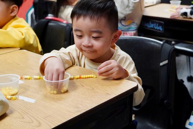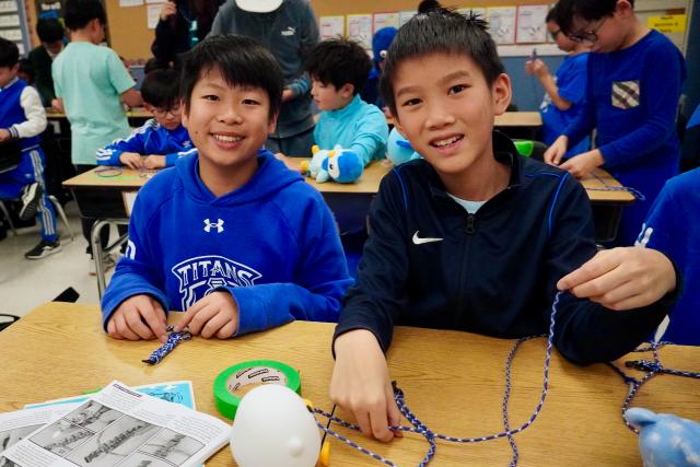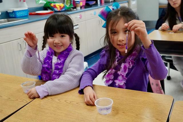 After the assembly, students went to different classrooms by house team and age group to make friendship bracelets in their team colours. Grade 7 & 8 students led the activity. Older students helped younger ones. Hopefully, through the process, they even made new friends!
