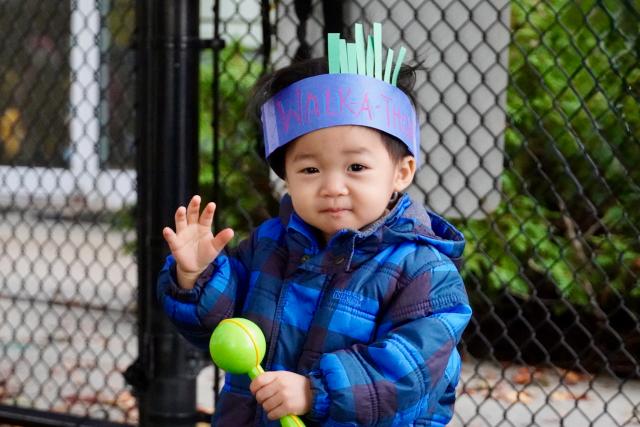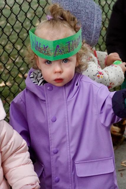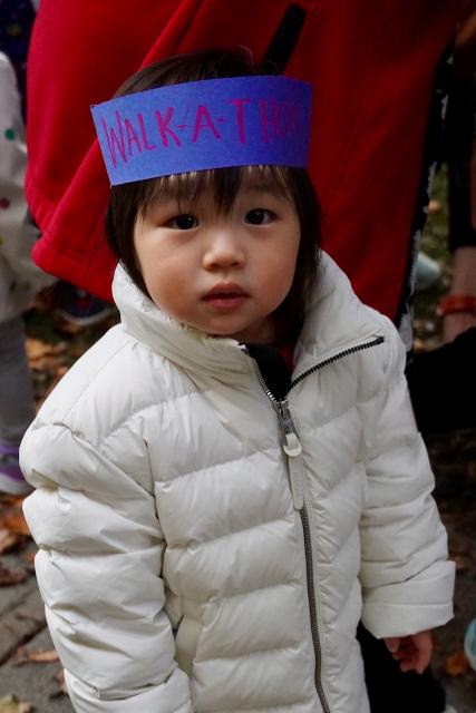 Our Toddler 1 class walked in their enclosed playground at the front of the school. To make it a little different than their regular outdoor time, they were given musical instruments and streamer ribbons, and were encouraged to walk with them. Some even work special Walk-a-thon crowns! As this was all new to them, some were a little perplexed while others enjoyed the new experience.