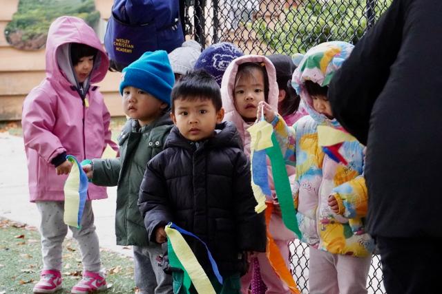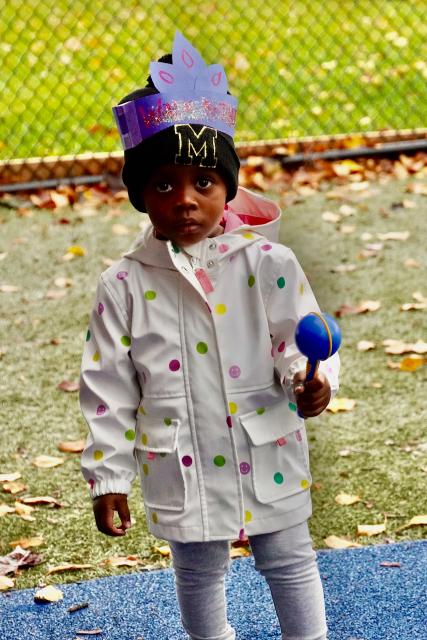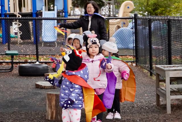 Our Toddler 2 and PK1s also waved ribbons to familiar songs as they walked around their playgrounds. They were able to follow their teachers and march around the perimeter. PK2 used a dress-up theme to make their experience fun. Led by Mrs. Brown in an astronaut suit, many of the students had capes, police officer outfits, and other costumes on. After a few loops around their playground, the outside time turned into a dance party!