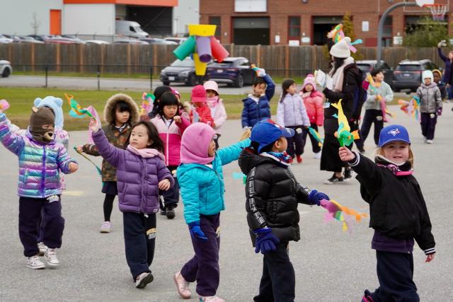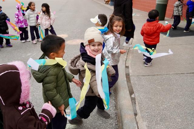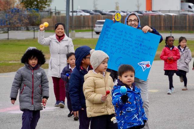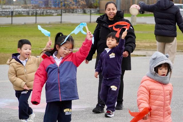Our JK and SK students walked together in the elementary playground. With catchy music blasting from the gym doors, the students danced, jumped, waved ribbons and walked laps around the paved area. Some even received stickers for every lap they completed!