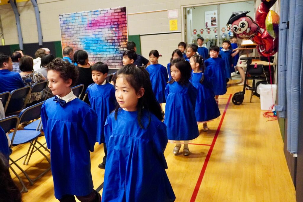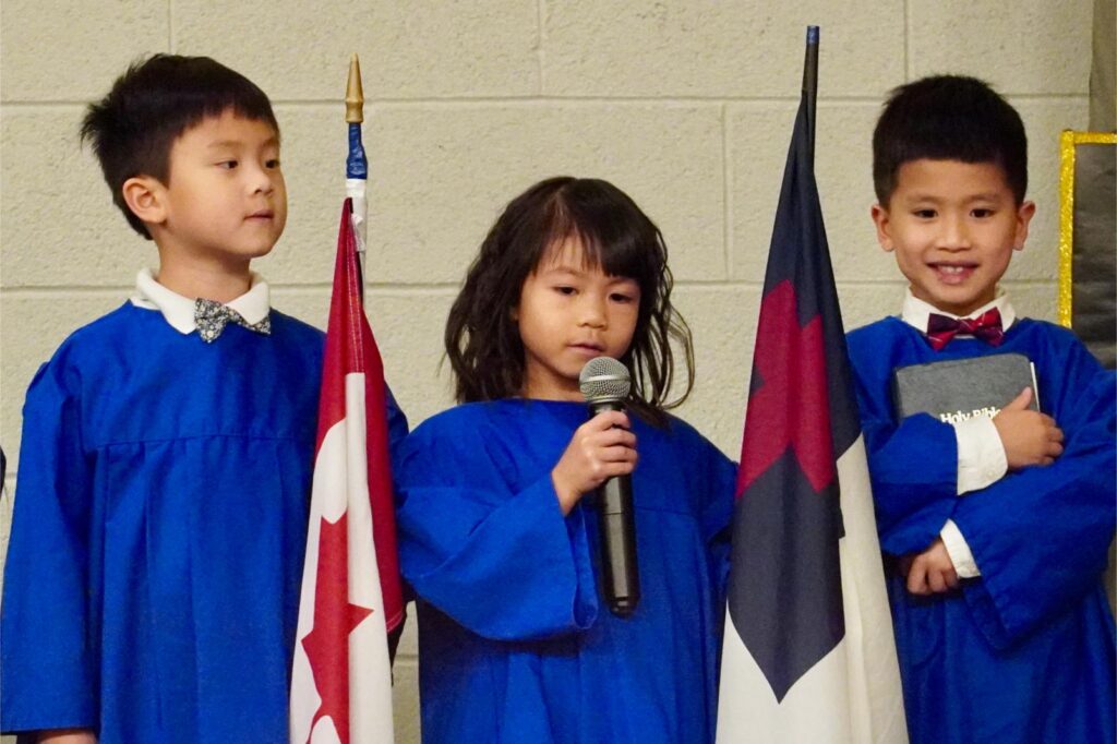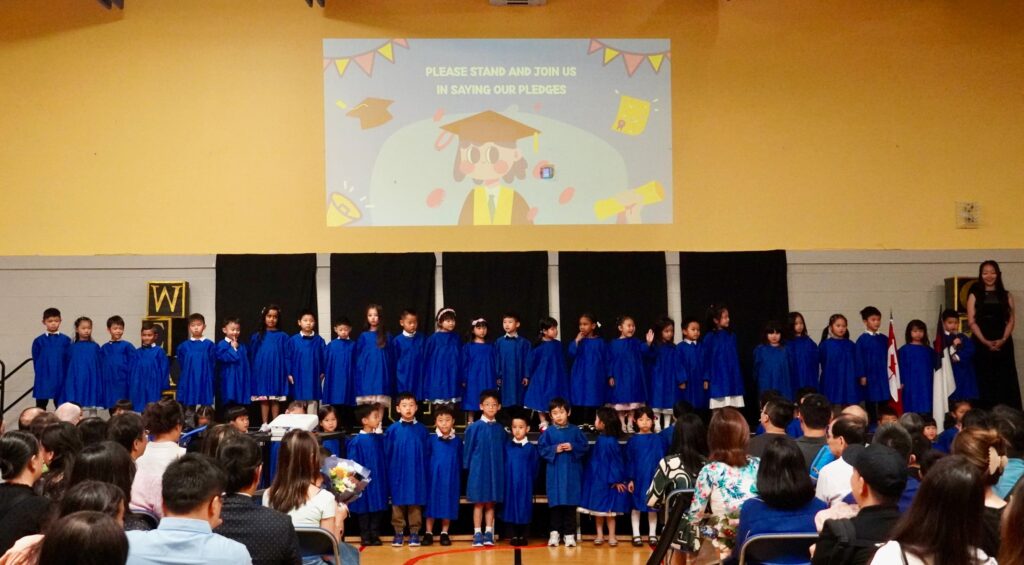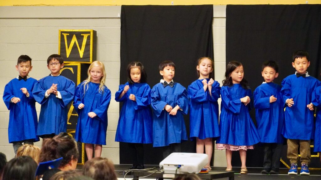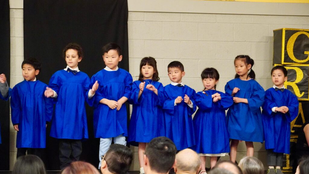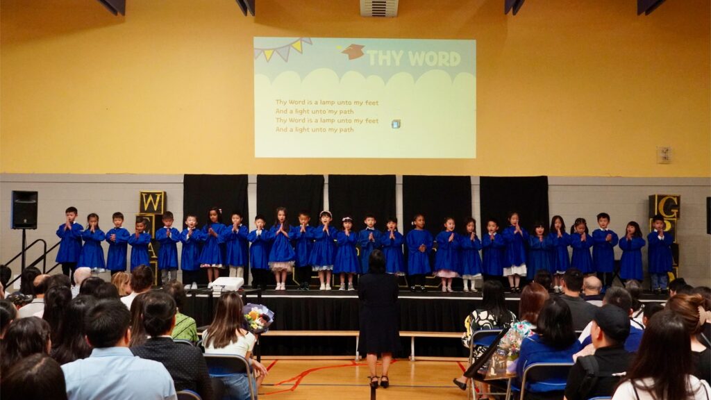 The SK2 class ascended the stage first while the SK1 class lined the front of the gym. Once in position, a few of the SK2 students led the audience through the pledges, recitation of the Lord’s Prayer, and the singing of O Canada. This is how they started each school day at Wesley, and they wanted to start their special ceremony the same way.