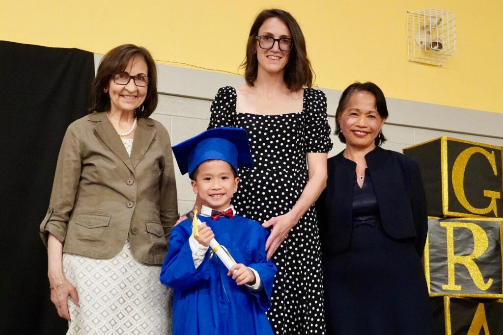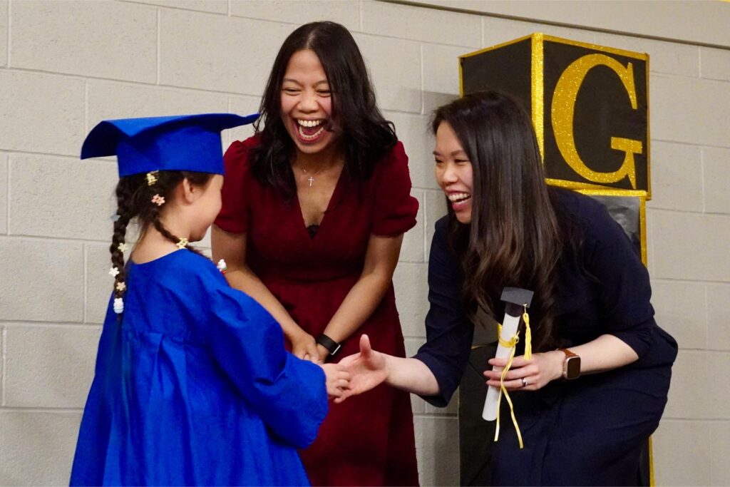 Our SK2 class received their diplomas first from their teachers – Mrs. Li, Mrs. Wu and Mrs. Chioconi. This was followed by Mrs. Kaske and Mrs. Yu’s SK1 class. As each student was announced, Mrs. Scott shared some small facts about the individual and the profession they aspire to have in the future. As you can imagine, there were some expected choices such as policemen, fire fighters, doctors and veterinarians. However, a few chose the careers of their parents and one even declared that she wanted to be a “mommy with lots of kids”. Each student walked across the stage gracefully, shook their teacher’s hand, accepted their diploma and posed for a photo! Kudos to the graduates and their teachers for all the hard work and practices that went into preparing for this moment.