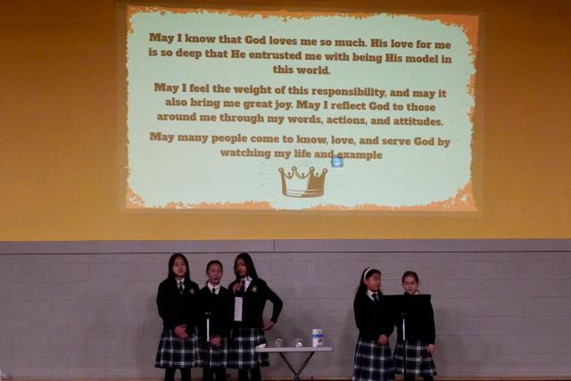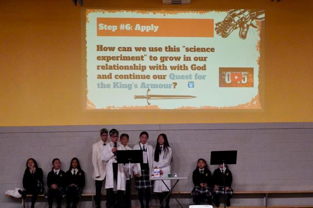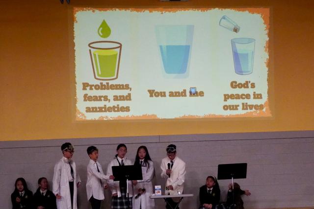 After the singing, new groups of Grade 8 students led a discussion about how we can use this information to grow in our relationship with God. They explained that we are the plain water in the cup. God is like the salt in the experiment. With Him, he provides the peace and strength we need to withstand and keep the anxieties, problems and fears (green water) out of our lives. They emphasized that we can armour up with peace by fixing our eyes on Jesus – which is not a “one and done” task. It is a constant choice we must make in every situation we face – day by day, hour by hour, minute by minute. Jesus understands our need for peace in our lives and wants us to let Him help us.