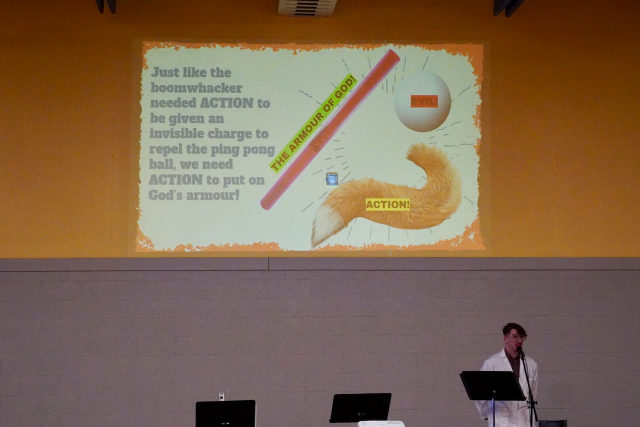 After the singing, Mr. Bailey discussed how we can use the information from the experiment to grow in our relationship with God. He focused on Ephesians 6:10-12 – our theme passage. He explained that we need to be intentional in our actions – just like intentionally charging the boomwhacker with negative ions to repel the ping pong ball. We need to be intentional about putting on the armour of God to help us grow (and repel evil). That means we need to