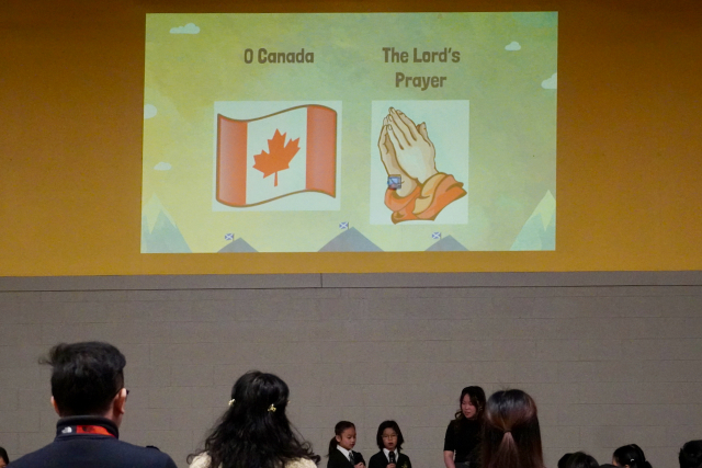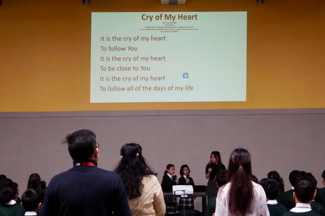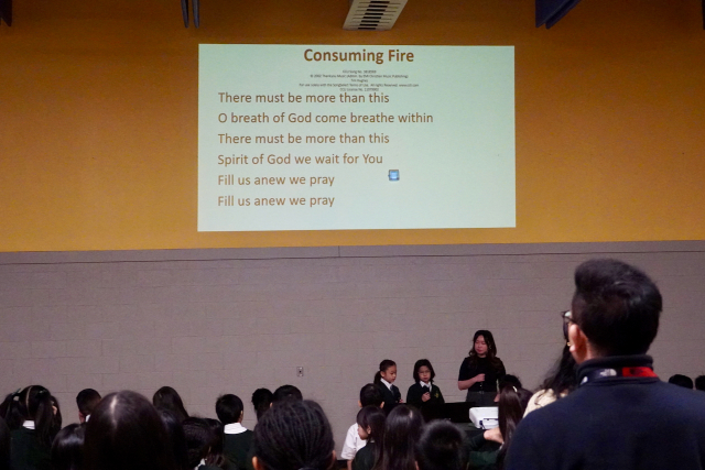 Today, a smaller Chapel Team 2 led our elementary chapel service. As our Grade 7-8 Senior Band was away performing at the Kiwanis Festival, there were fewer students in the gym as well. After leading the audience through O Canada, The Lord’s Prayer and the Land Acknowledgement, Chapel Team 2 led the singing of “Cry of My Heart” – a song about one’s desire to follow and be close to God all the days of their life.