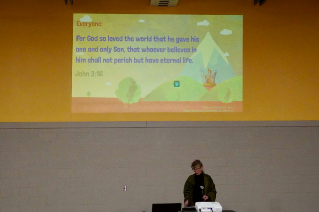 Next, Mrs. V, dressed as “Lady Loves-to-Learn”, graced us with a grand entry to the sound of trumpets. She led a review of our theme verse and all the “Armour Up” sub-themes. Then, she asked various grades to read specific Bible verses that supported our Armour of Salvation sub-theme and included verses that revealed all have sinned and need the gift of salvation. Everyone then said a prayer together, thanking God for sending His Son and asking Him to help us choose to live lives that make it obvious that we are His children.