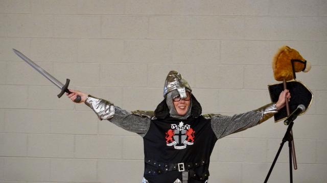 Next, Sir Learns-a-lot asked for six student volunteers to go to the front and put on a prop. Each item represented a piece in the Armour of God. Sir Learns-a-lot then explained each component and how we can use it daily in our journey for God’s kingdom.