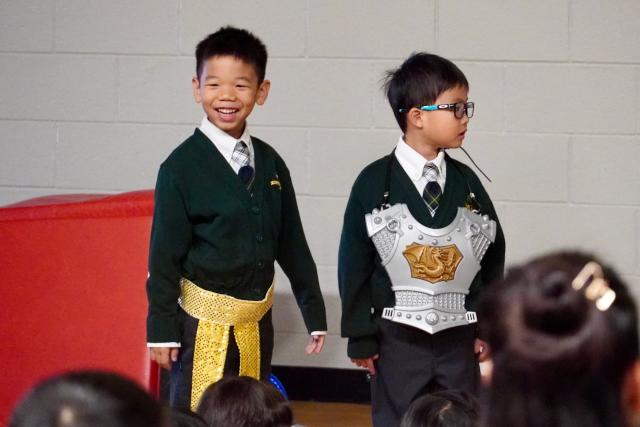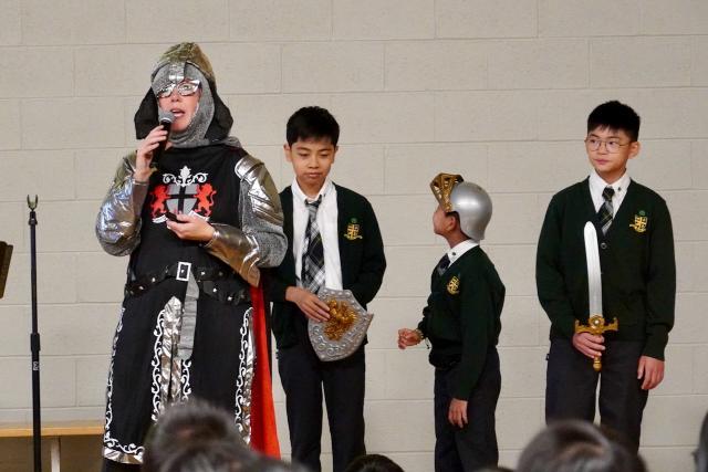 The rest of the service was spent introducing this year’s theme – “Quest for the King’s Armour”. To the cue of some trumpets announcing her royal entry, Mrs. Vant Erve, dressed in knightly attire, introduced herself to the students as “Sir Learns-a-lot”. Sir Learns-a-lot shared the theme and key verse taken from Ephesians 6:10.