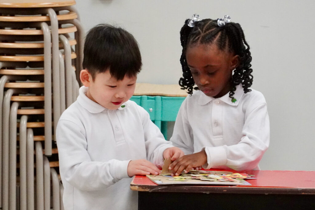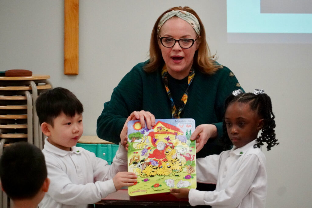 After the song, she had two SK volunteers go to the front. They were given a puzzle to put together. After a few minutes of working on it, Mrs. Michelle started to help. However, even with Mrs. Michelle, the team still needed help. A teacher joined the group and soon the puzzle was finished to reveal a picture of Noah’s Ark! Mrs. Michelle then had a short conversation with the two SK students about the challenging puzzle and reinstated today’s verse and theme to reassure them that nothing is impossible with God’s help.